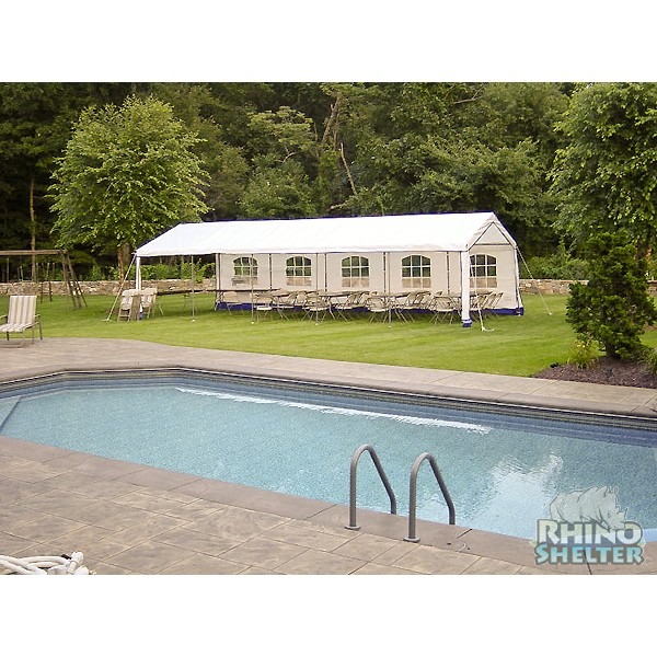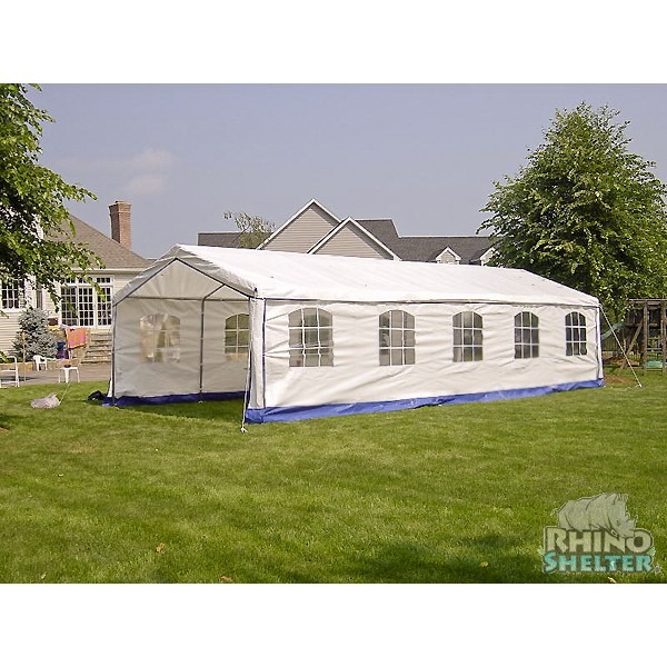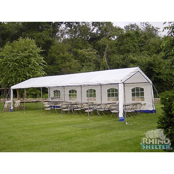 The sturdy steel frame is coated with gray powder to compliment the white cover with blue trim. The side panels sport attractively framed windows on either side for maximum light and open viewing. Our fabric components are CPAI-84 fire-rated- making these perfect for any outdoor event, even public ones. Line up our party tents side to side or door to door for larger events. You can easily fold away these tents and use the convenient storage bag for easy transportation and convenient storage.